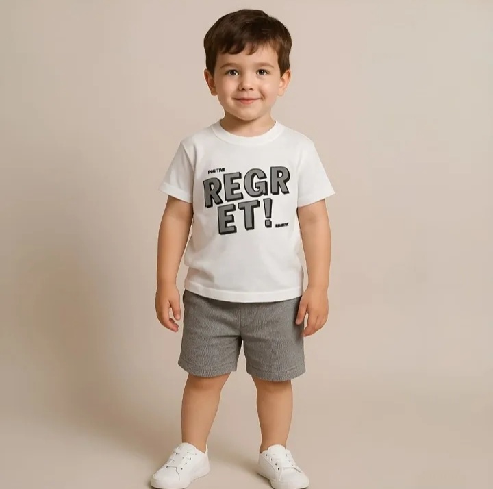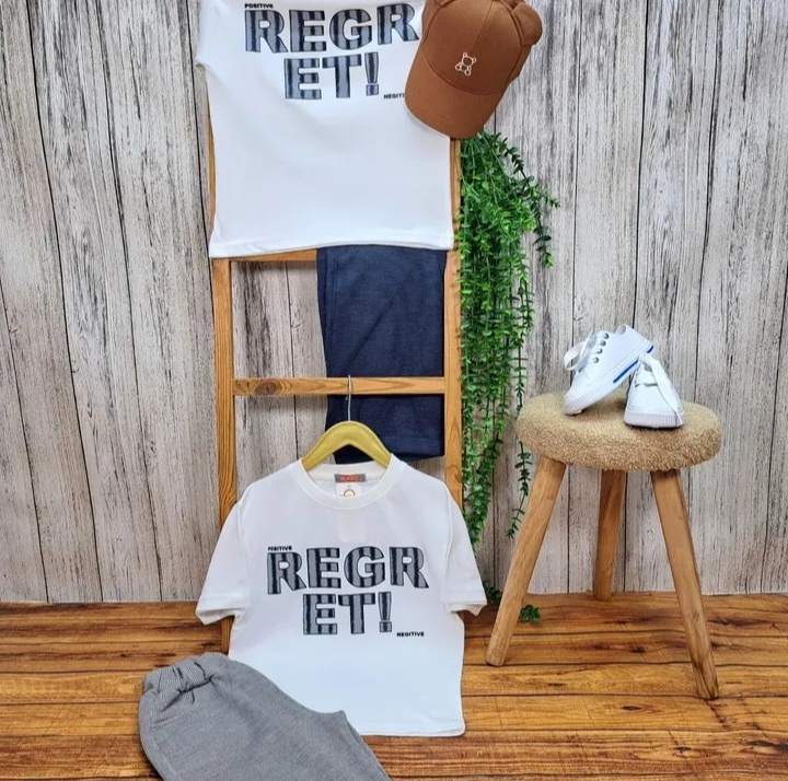 چاپ برجسته و مدرن کلمه REGRET روی تیشرت جلوهای خاص و متفاوت ایجاد کرده که مورد علاقهی پسر بچهها خواهد بود.