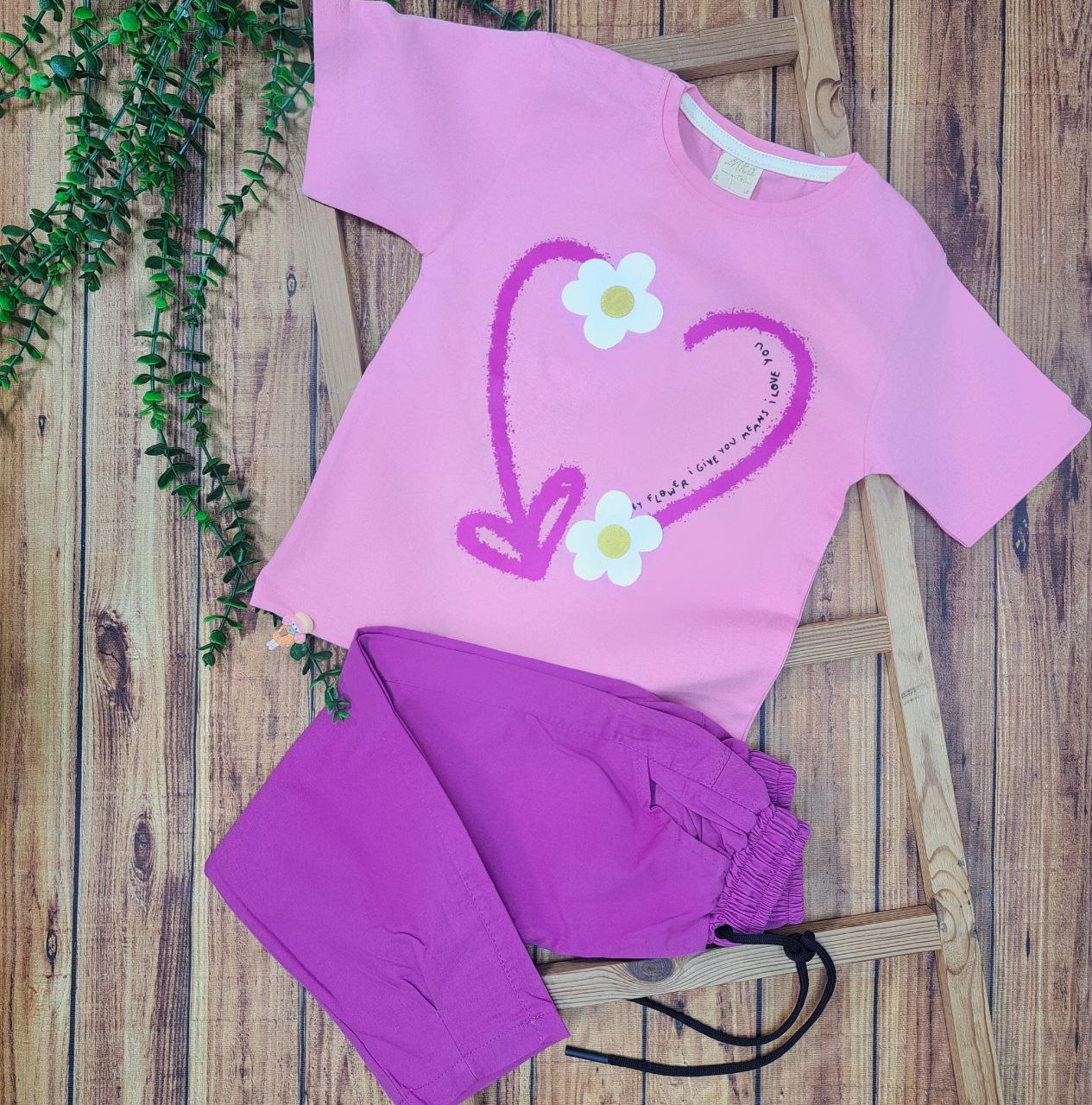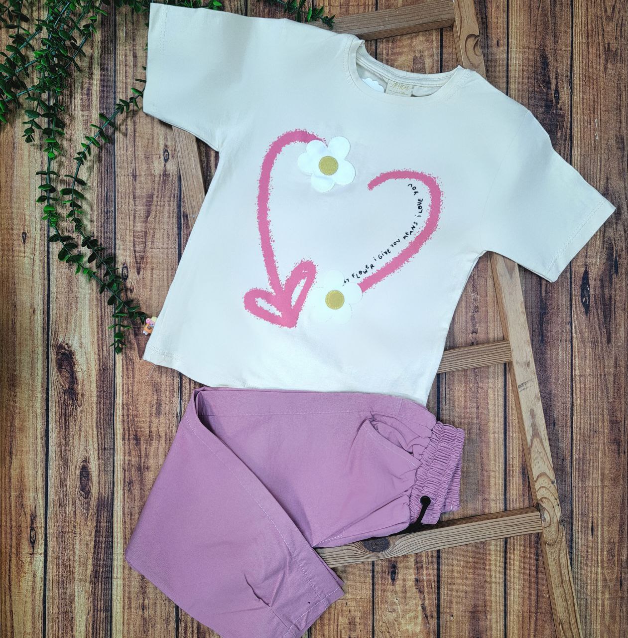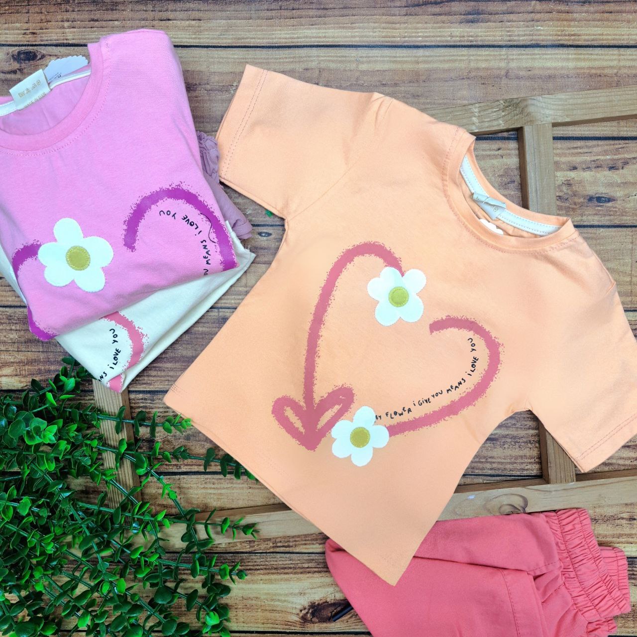 تیشرت از جنس نخ پنبهای خنک و لطیف تهیه شده که پوست حساس کودک را اذیت نمیکند و در روزهای گرم تابستان حس راحتی و سبکی ایجاد میکند. طراحی آن با طرح قلب و گلهای فانتزی، ظاهری شیرین و کودکانه به لباس داده است.