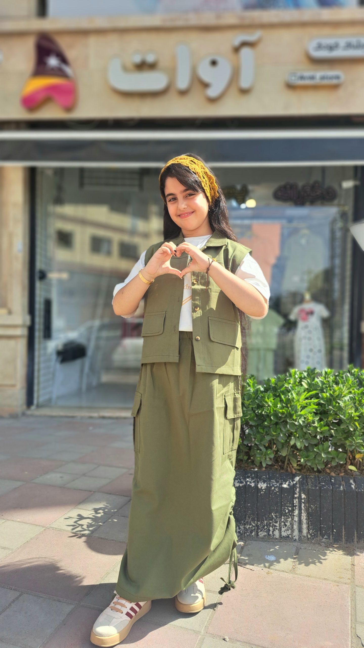 رنگ اصلی ژیله و دامن: سبز زیتونی و کرم که حس استحکام و راحتی را القا میکند.