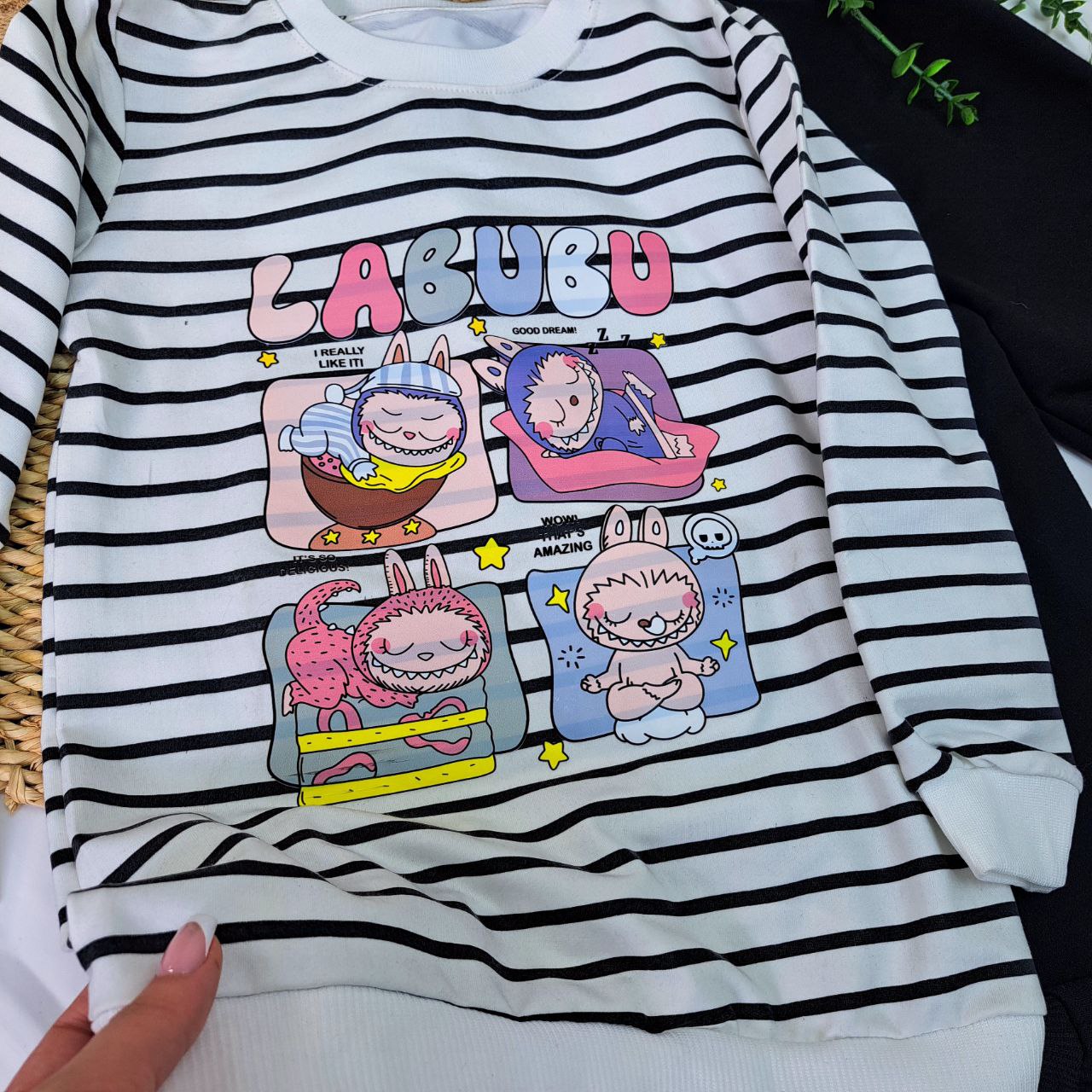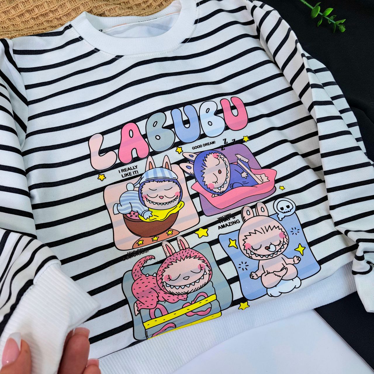 بلوز دارای طرح فانتزی و رنگی شخصیتهای محبوب LABUBU بوده و روی پارچه راهراه سفید مشکی چاپ شده است.