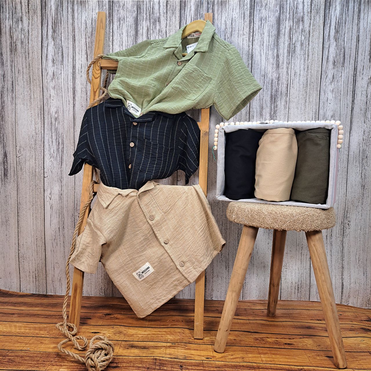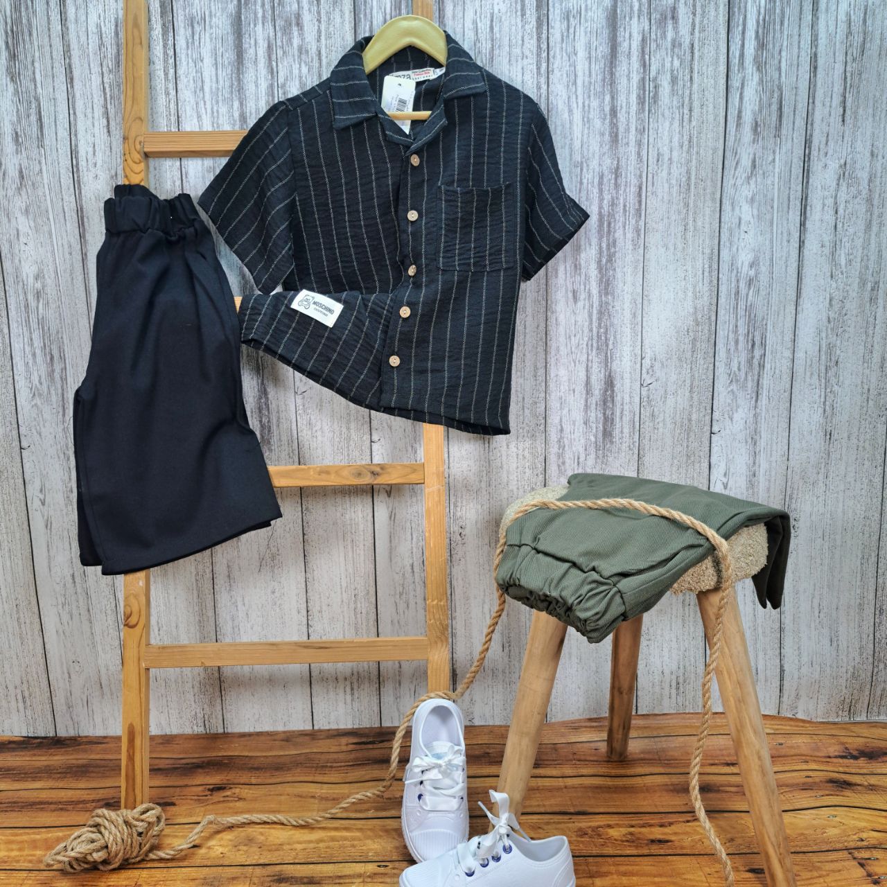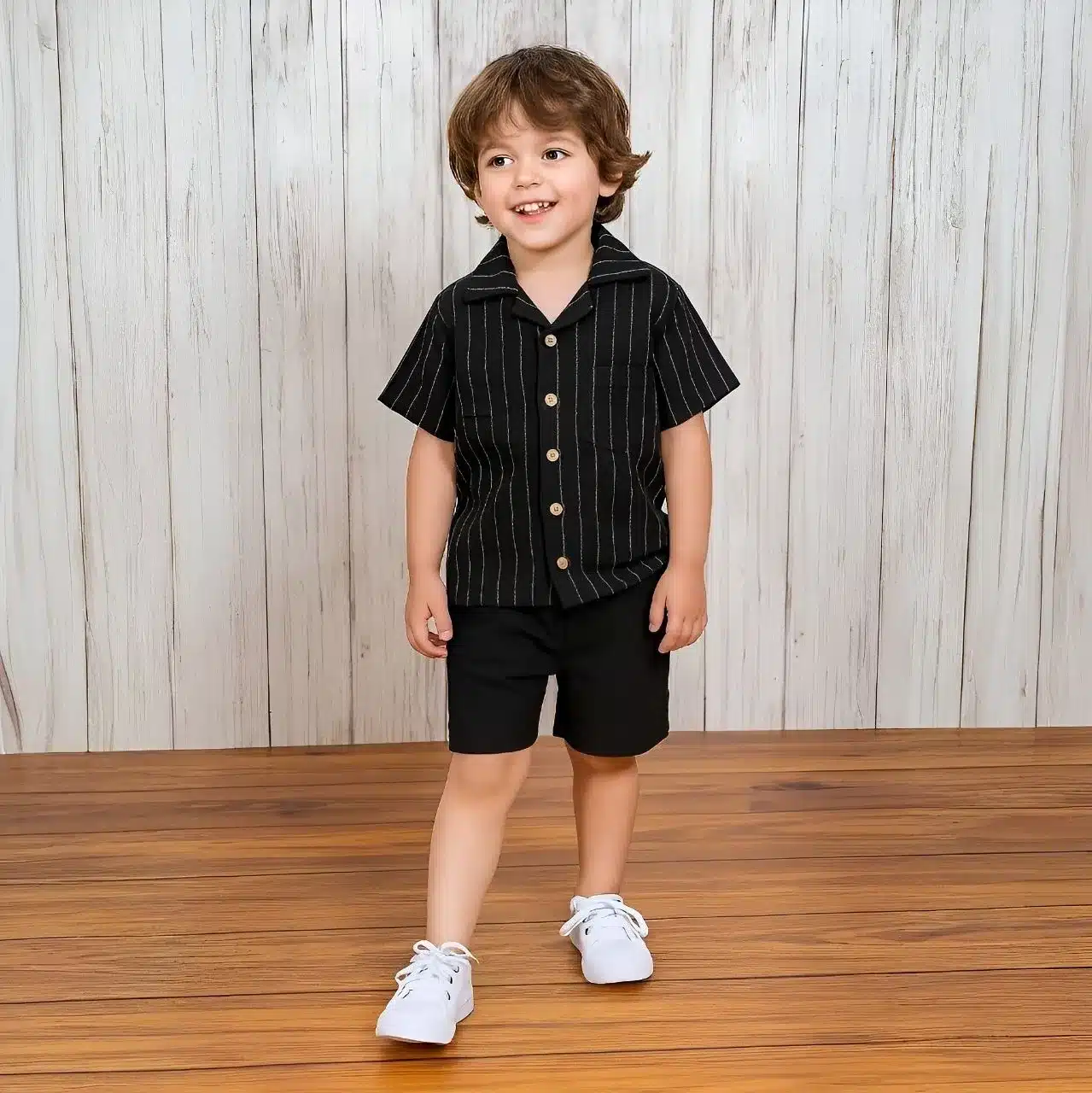 طرح و مدل: شومیز مشکی با خطوط راهراه ظریف و دکمههای چوبی طراحی شده که جلوهای شیک و اسپرت به استایل کودک میدهد. یقهی باز و آستین کوتاه، ظاهر مدرن و خنکی بیشتری ایجاد کرده است. شلوارک ساده و یکرنگ مشکی نیز به راحتی با شومیز ست شده و استایل مرتب و جذابی برای کودک میسازد.