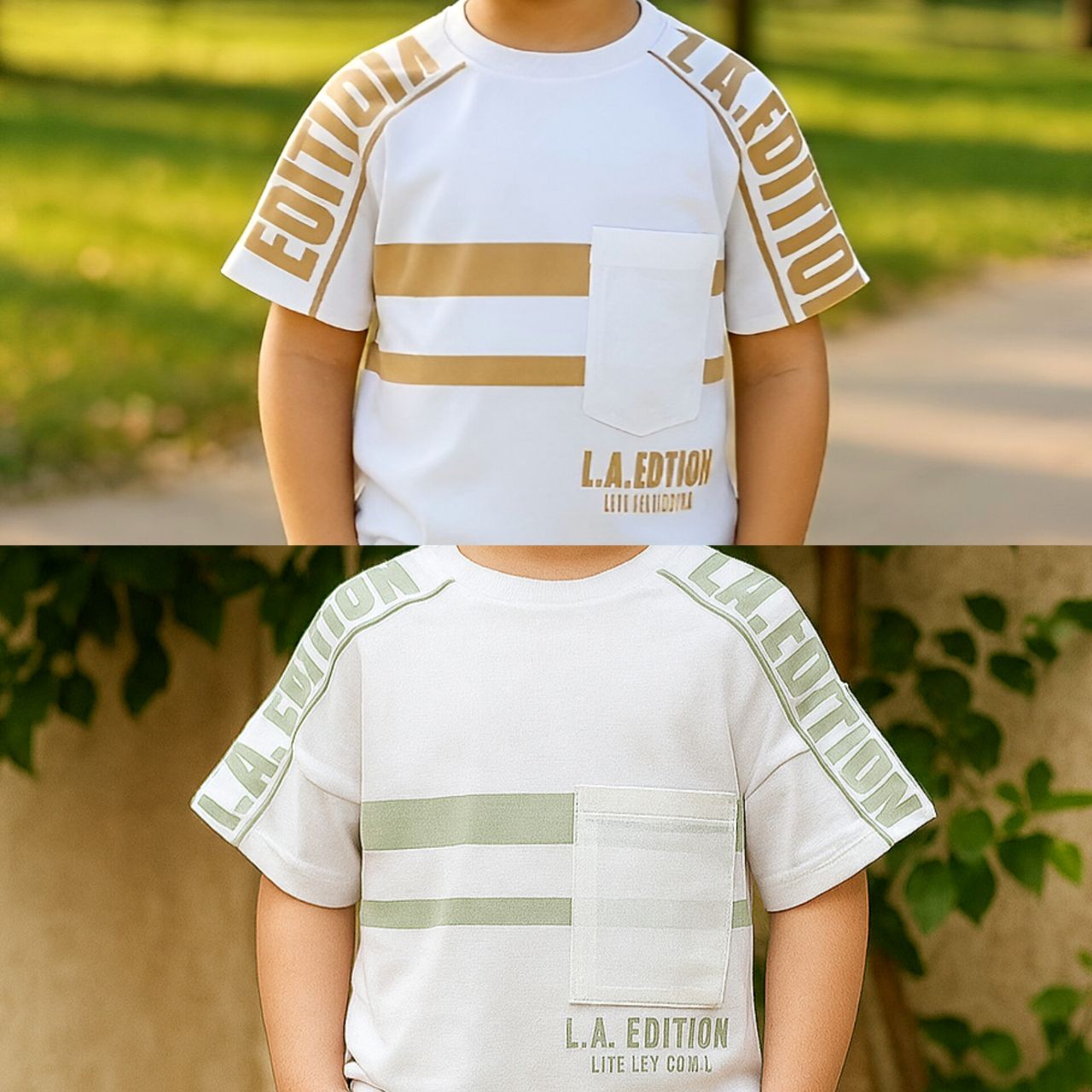 - طراحی: دارای طرح راهراه ملایم به همراه جیب روی سینه و نوشتهی چاپی برای ایجاد استایلی اسپرت و کودکانه.