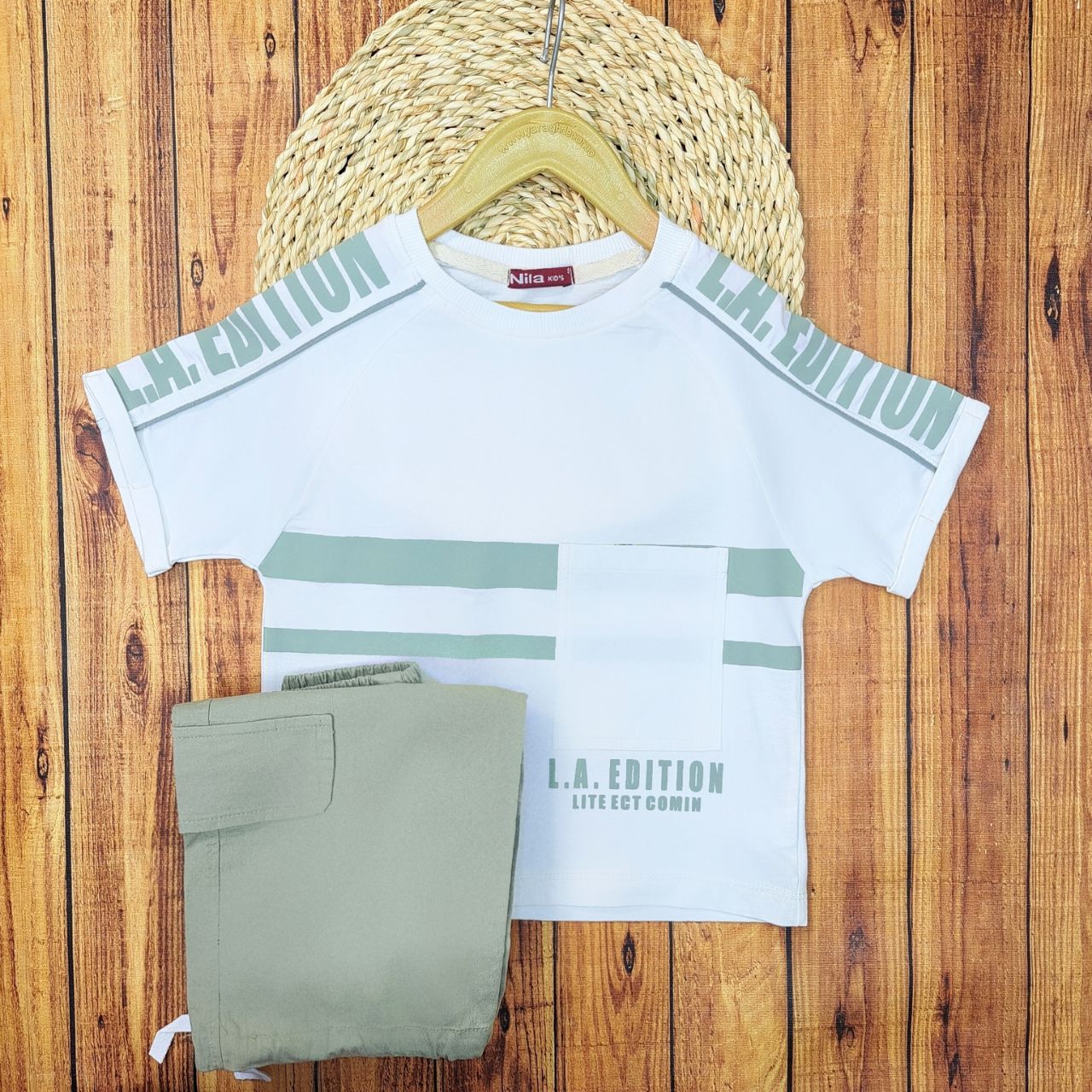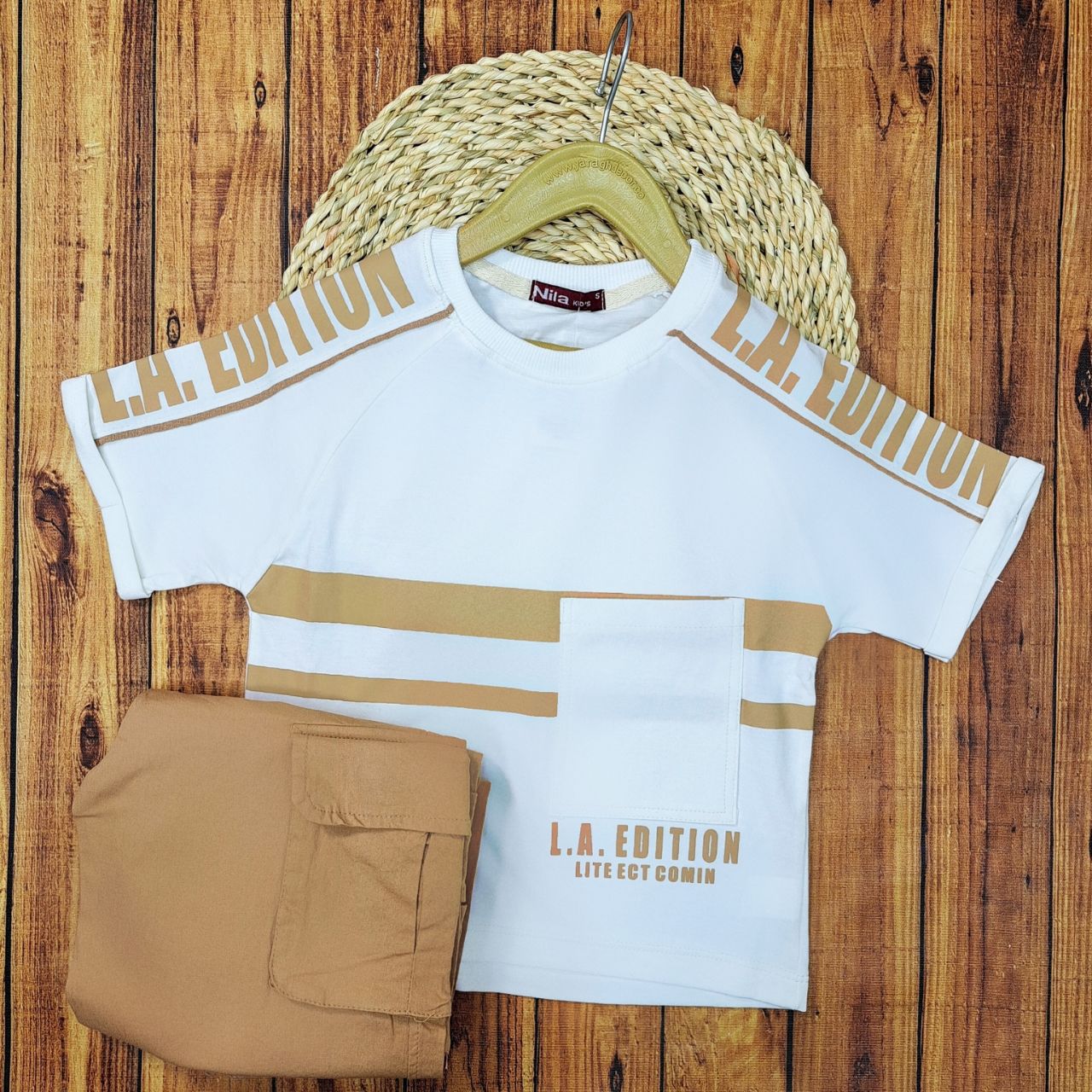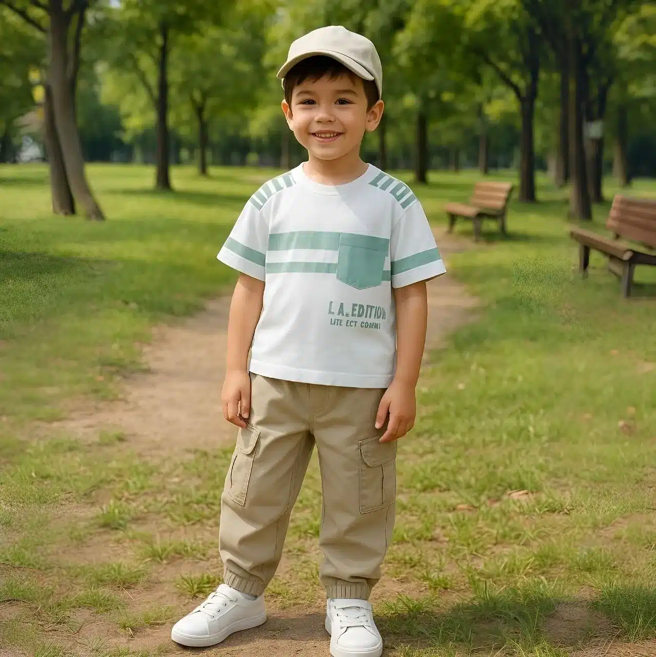 این ست پسرانه شامل یک تیشرت و شلوار کتان است که ترکیبی جذاب و راحت برای استفاده روزمره کودکان محسوب میشود.